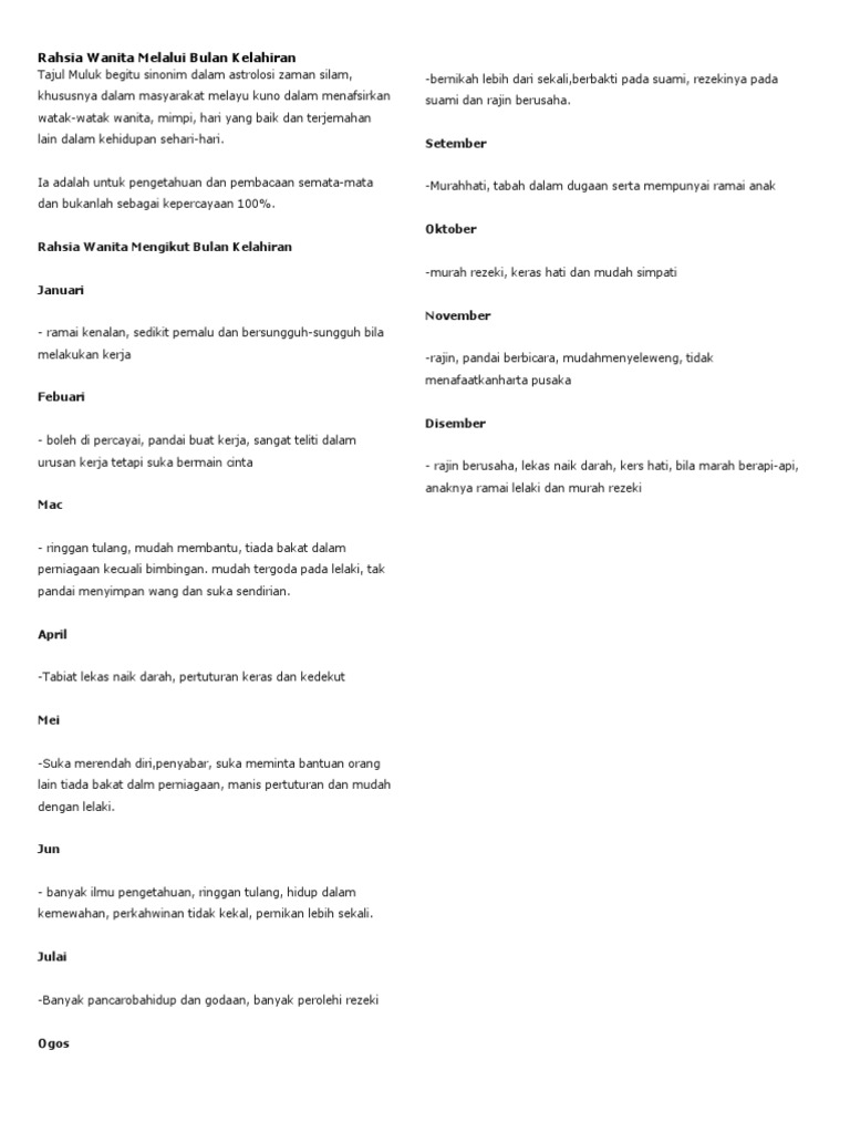 Rahsia tarikh lahir wanita. 1 - kerjaya yang sesuai tidak sesuai 2 - arah kejayaan anda 3 - arah kekayaan anda 4 - dimanakah arah tuah anda 5 - apa yang bakal berlaku disepanjang 5 tahun akan datang 6 - apa yang. Seorang yang mahir dan mempunyai personaliti yang menarik. Cara Pengiraan Rahsia Tarikh Lahir Sebagai contoh kami ambil tarikh bayi yang lahir pada 21 Mac 2012 dalam pengiraan rahsia tarikh lahir seperti di bawah.