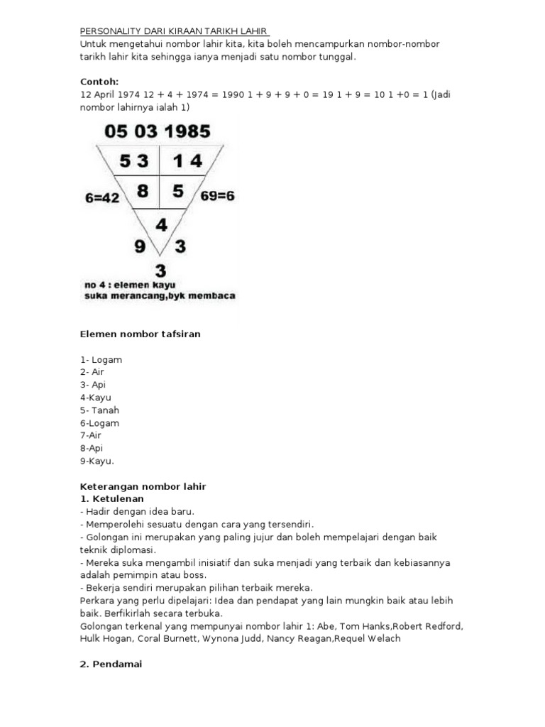 11011979 Kelebihan Seorang pendamai dan penyayang suka membantu orang lain peramah cenderung kearah peka. 123 jadi number laHIR ADALAH 3 Keterangan nombor lahir 1. Jom kenali potensi diri anda.
