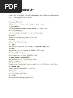 Rukun bermakna SYARAT_SAH solat. Wudhuk dan pergerakan solat 11. Dengan itu tidak lengkap dan tidak sah sesuatu solat itu jika tertinggal salah satu rukunnya.